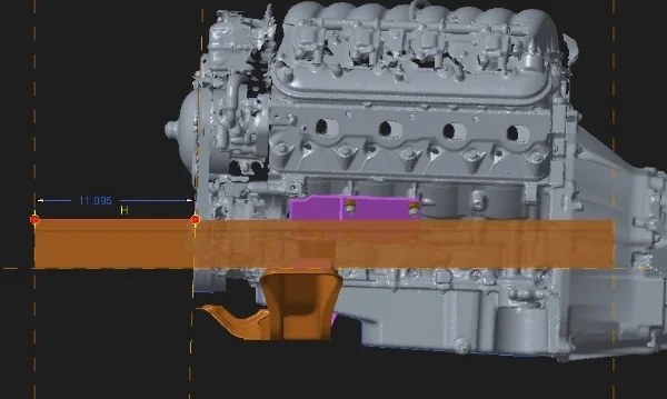While much of the engine could be left as raw scan ata for packaging the corssmember needed to be reverse engineered into a solidZ CAD geomtry. Using 2D crossections of the scan a parametric model was created that matched the scan very closely. The original scan and the new CAD geometry is shown below.